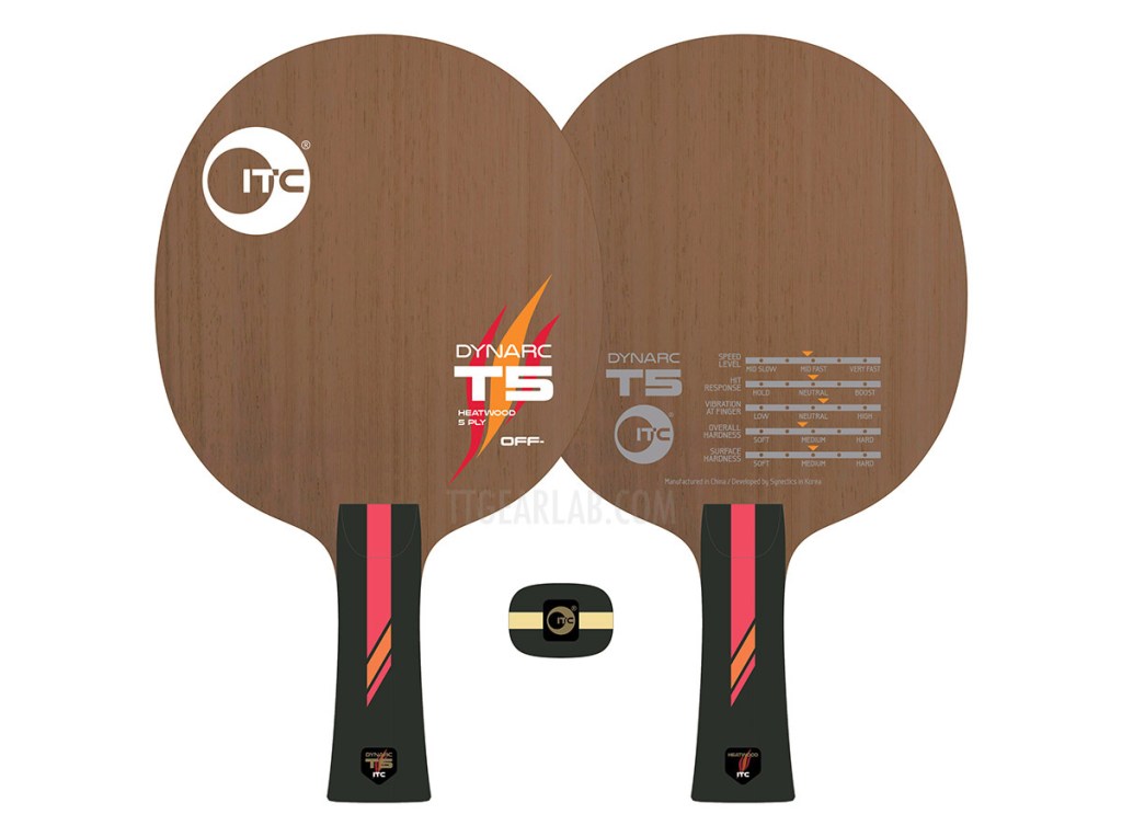 Dynarc T5 is a thin 5-ply wood blade for close-to-table topspin. The tanne wood of its middle layer makes very sharp feeling. It makes very good combination with Chinese sticky rubbers or not-sticky rubbers those are biased to spin. Because Dynarc T5 is very easy-to-use, it was also considered as the entry model of ITC blade range.
