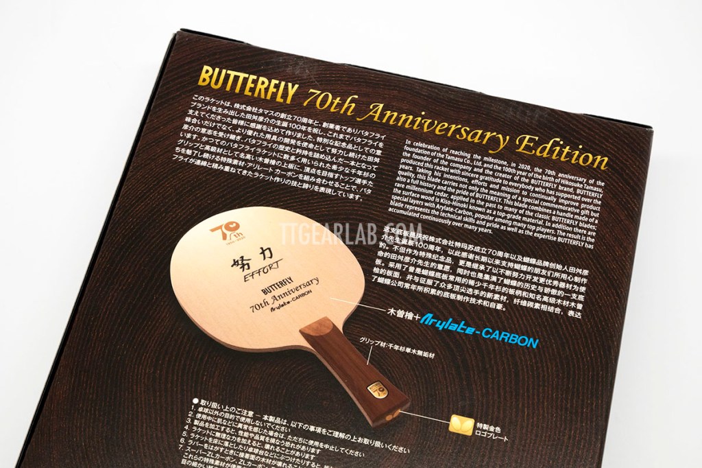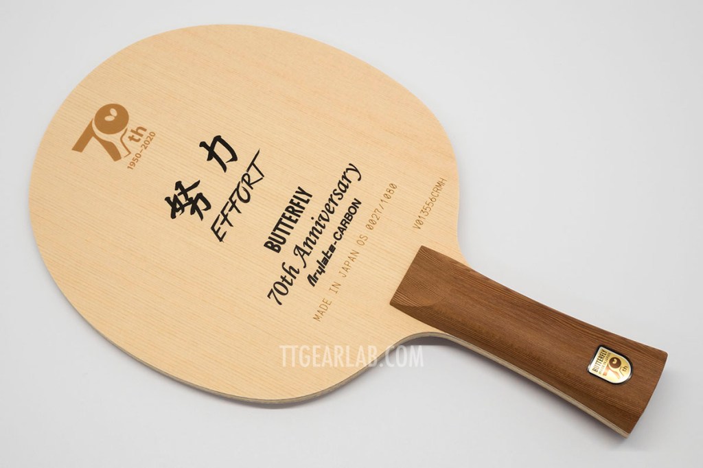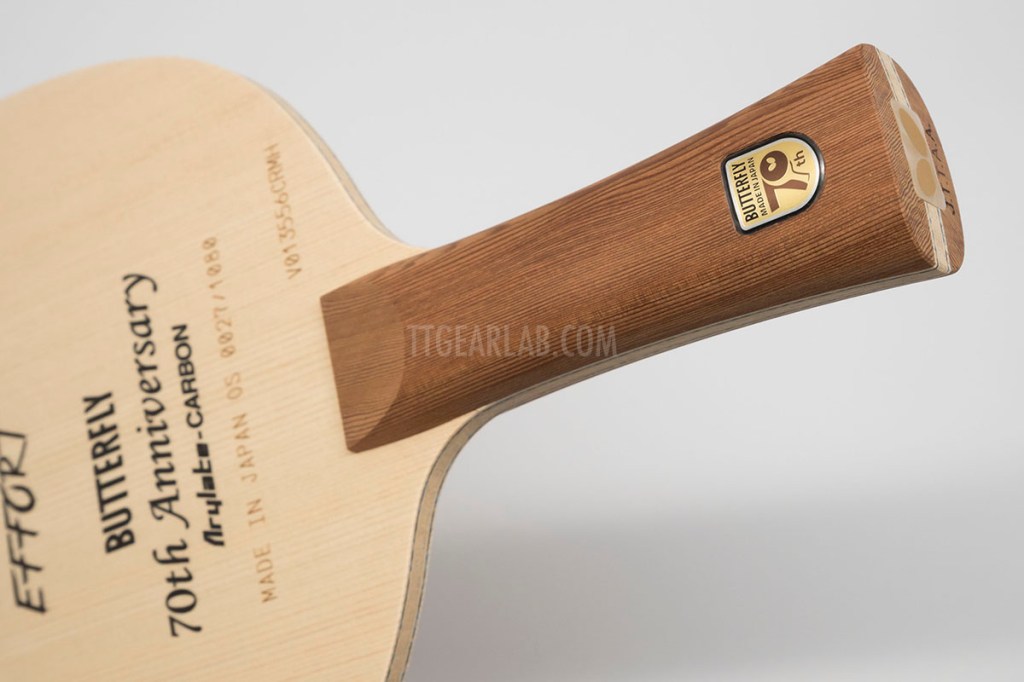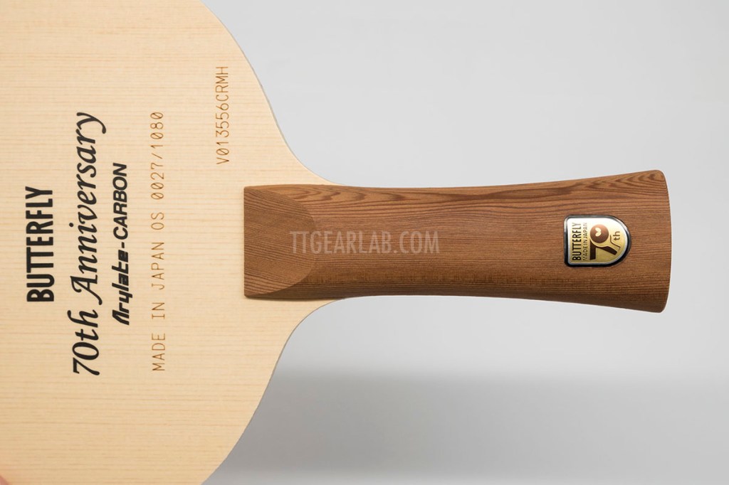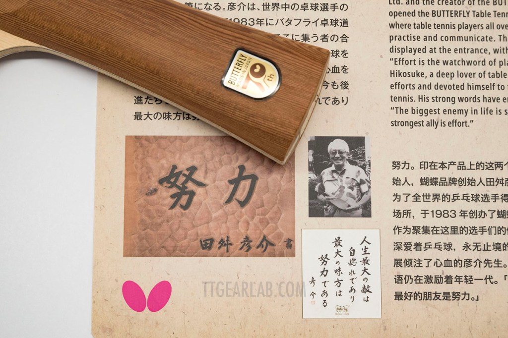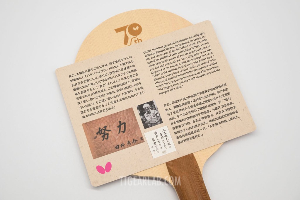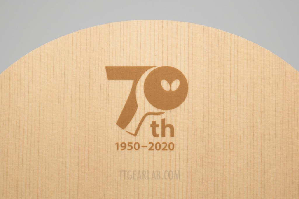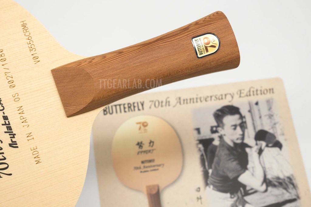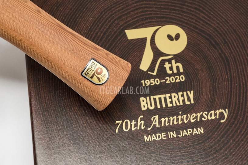 ‘Butterfly 70th Anniversary’ blade announced in May 2021 is a limited edition product made to commemorate the 70th anniversary of Tamasu Co. (= Butterfly) and the 100th anniversary of the birth of its founder. Kiso Hinoki wood was used for top layer to emphasize the Butterfly’s tradition, and ALC which has led the success of Butterfly fiber blades was selected as a fiber of this blade. As the material for the handle, raw wood of millennium cedar which was used for numerous Butterfly blades until the 1990s was selected. The construction of plywood is 5+2 ply outer-fiber construction. Overall thickness is around 6.0mm.