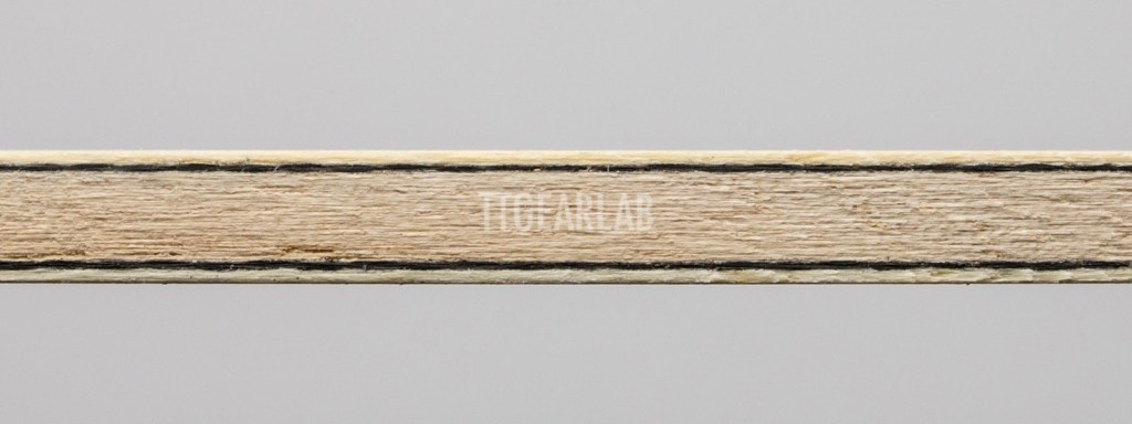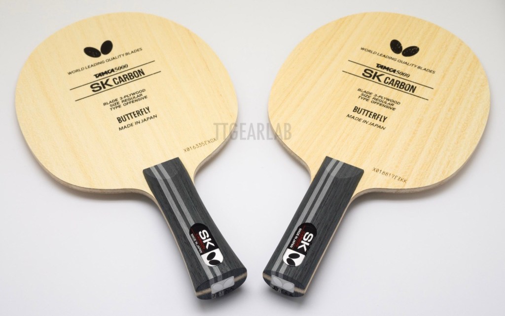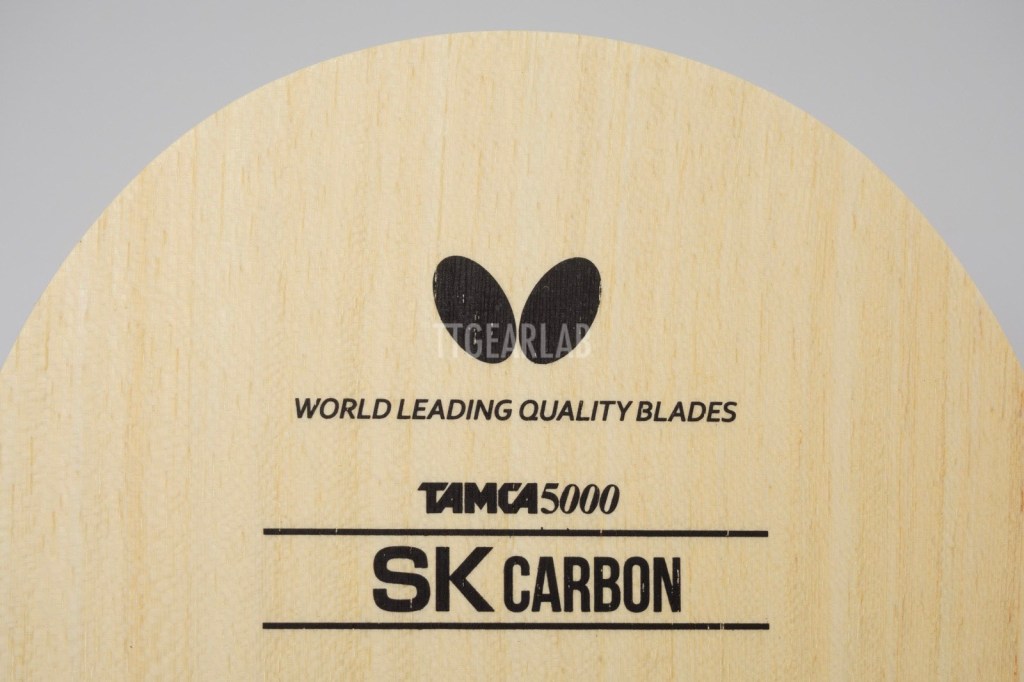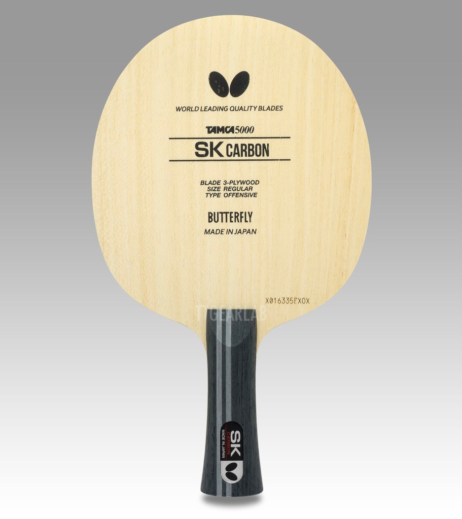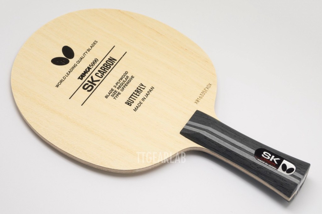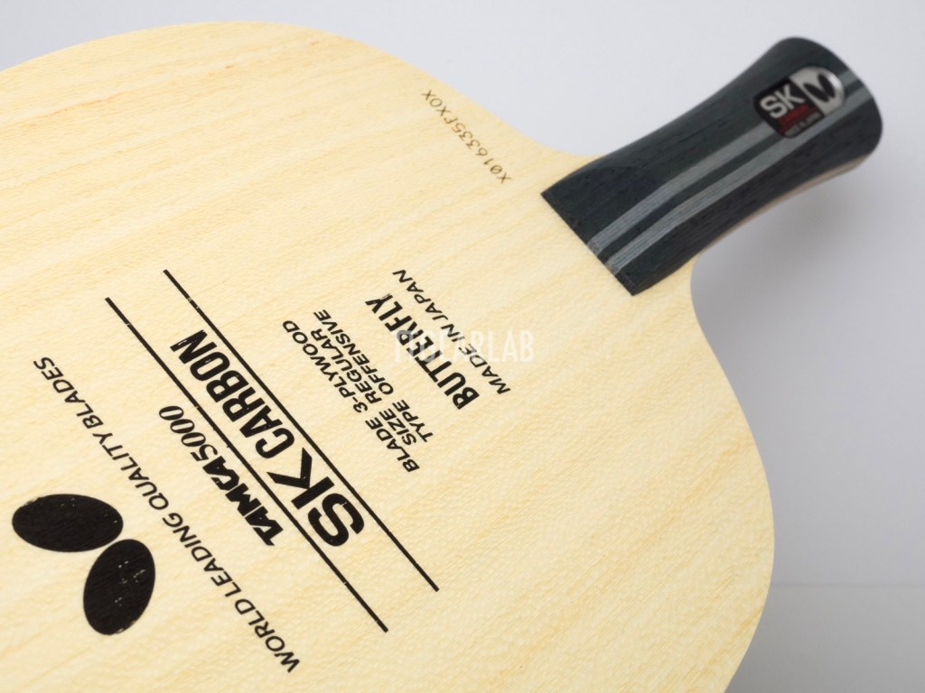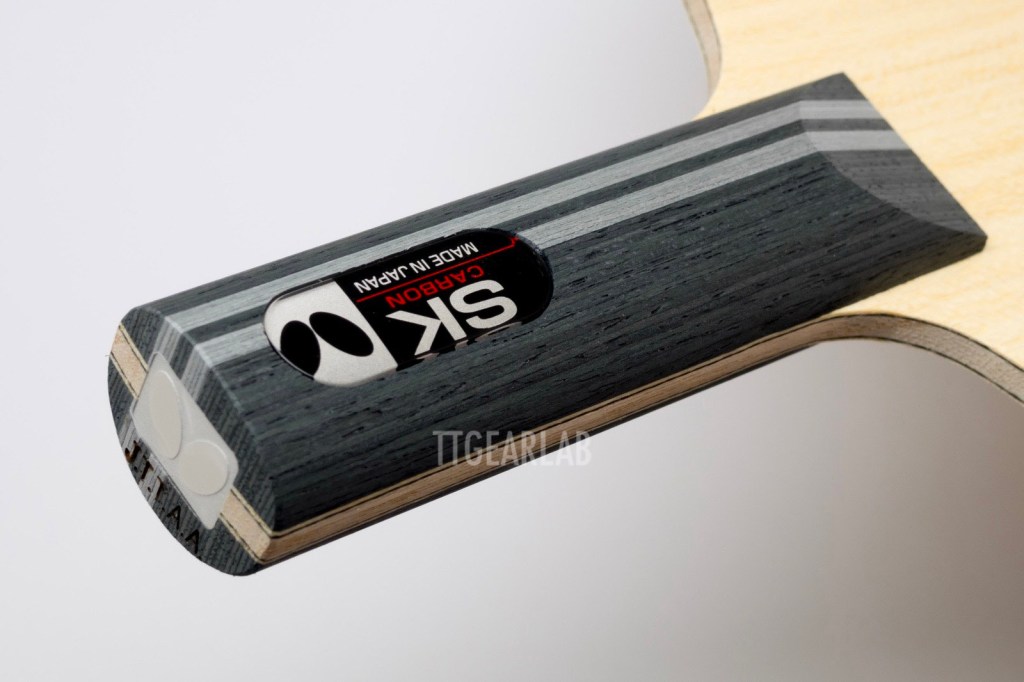 Blade construction is 3+2 construction like ‘Primorac Carbon’ which is a very fast carbon blade. But, ‘SK Carbon’ isn’t as fast as ‘Primorac Carbon’ because it has much thinner construction. Overall thickness is around 5.2mm. Top layer is Koto and center layer is Kiri. (There isn’t middle layer.) TAMCA 5000 which is the woven carbon fiber of Butterfly is inserted between the top layer and the center layer of ‘SK Carbon’.
