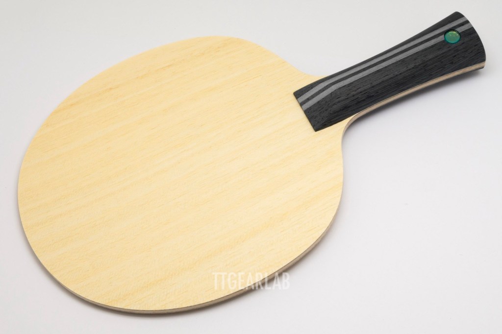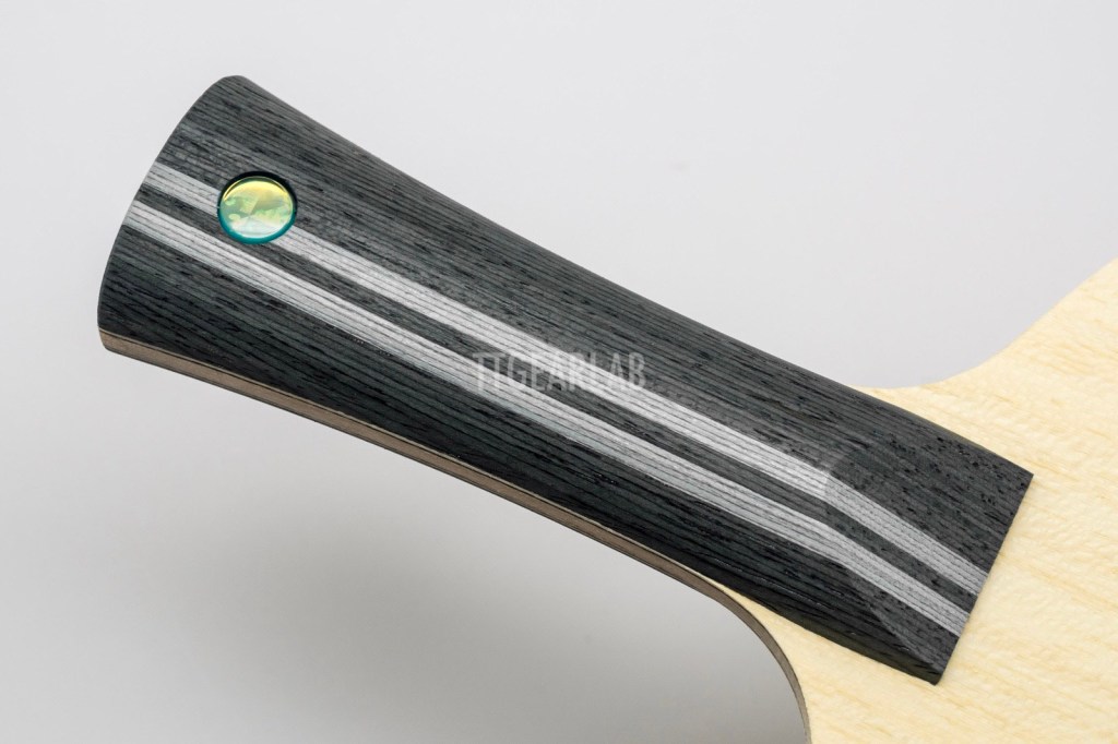 The shape of FL (flared) handle is different from the Butterfly standard FL (for most of Butterfly blades including ‘InnerForce Layer’ series) or Butterfly semi-wide FL (for ‘Viscaria’, ‘Fan Zhendong’ series and so one). The width is around 26mm (at top) ~ 27mm (at bulge) ~ 26mm (at narrowest section) ~ 34mm (at the end), and the thickness is around 23.4mm (at thumb) ~ 24.4mm (at the end). Although it appears thick in terms of size, it is somewhat slim when held because the cross-sectional shape is more shaved than the typical FL handles of Butterfly.