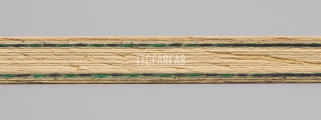 Above is the blade construction of ‘Synteliac VCI OFF. Voltema Carbon (= ALC) is placed between the middle layer and the center layer. The top layer is Limba, the middle layer and the center layer are Ayous. Overall thickness is measured as around 5.9mm.