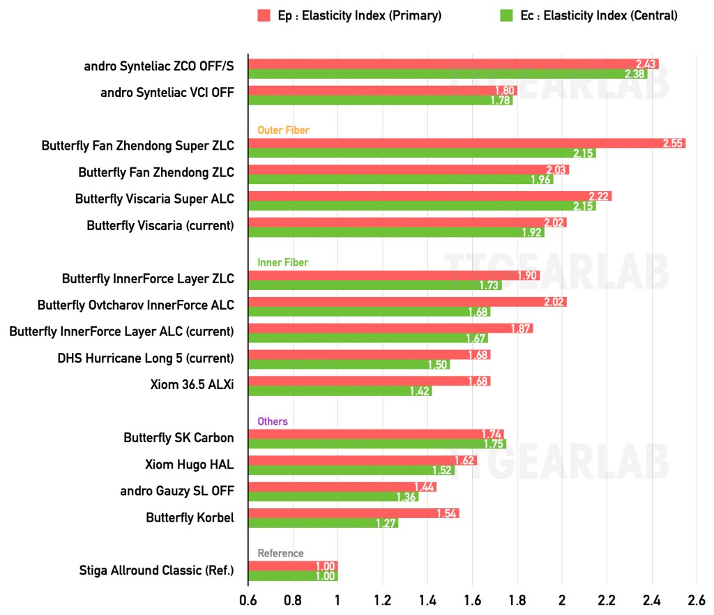 Then, let’s compare inner fiber blades with ‘Synteliac VCI OFF’. Its Ep is lower than those of three Butterfly inner fiber blades – ‘InnerForce Layer ZLC’, ‘Ovtcharov InnerForce ALC’ and ‘InnerForce Layer ALC’. On the contrary its Ec is higher than those of three Butterfly inner fiber blades. One common characteristic of inner fiber blades in this comparison (except for ‘Synteliac VCI OFF’) is that Ep is much higher than Ec. But, ‘Synteliac VCI OFF’ doesn’t show that characteristic. Therefore we can expect that the playing character of ‘Synteliac VCI OFF’ will be somewhat different from the playing characters of other inner fiber blades in this comparison.