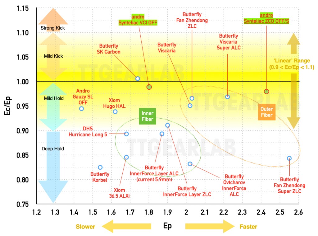 First, let’s observe the location of outer-ZLC version – ‘Synteliac ZCO OFF/S’. When we see only the primary elasticity indices, ‘Synteliac ZCO OFF/S’ is a bit less elastic than ‘Fan Zhendong Super ZLC’ However, differentfly from ‘Fan Zhendong Super ZLC’, ‘Synteliac ZCO OFF/S’ is placed close to the ‘Linear’ line (Ec/Ep = 1.0). It means that ‘Synteliac ZCO OFF/S’ will not hold the ball as deeply as ‘Fan Zhendong Super ZLC’ does when the player hits the ball very strongly. Instead, ‘Synteliac ZCO OFF/S’ will provide more power than ‘Fan Zhendong Super ZLC’ when the impact strength is high. On the graph, we can see that three other Butterfly outer fiber blades – ‘Viscaria Super ALC’, ‘Fan Zhendong ZLC’ and ‘Viscaria’ are at similar level of Ec/Ep as ‘Synteliac ZCO OFF/S’. Especially ‘Fan Zhendong ZLC’. Therefore, we will be able to consider ‘Synteliac ZCO OFF/S’ as faster ‘Fan Zhendong ZLC’.