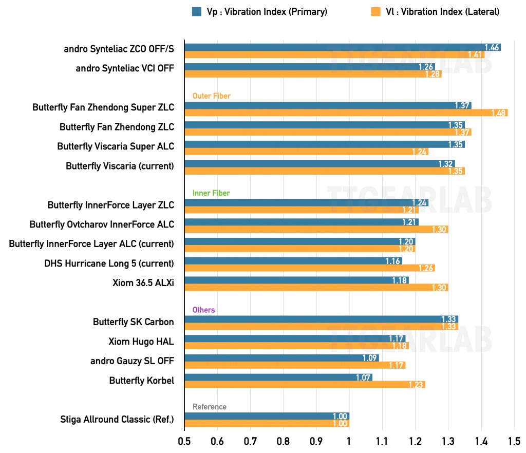 ‘Korbel’ is located too far from ‘Synteliac VCI OFF’. In many cases inner ALC blades are recommended for the players who want to replace Korbel to one step faster blade. That is thanks to the ‘Deep Hold’ characteristics of many inner ALC blades. However, ‘Synteliac VCI OFF’ can’t be recommended for the replacement of ‘Korbel’. Instead, ‘Synteliac VCI OFF’ can be recommended for the players who replace classic 7-ply wood blades to fiber blade. Although ‘Gauzy SL OFF’ isn’t a classic 7-ply wood blade, it makes sense to try ‘Synteliac VCI OFF’ as the replacement of ‘Gauzy SL’ for the enhancement of power, because both of ‘Gauzy SL OFF’ and ‘Synteliac VCI OFF’ are located in ‘Mild Hold’ range. Then next, let’s compare Vibration Indices.