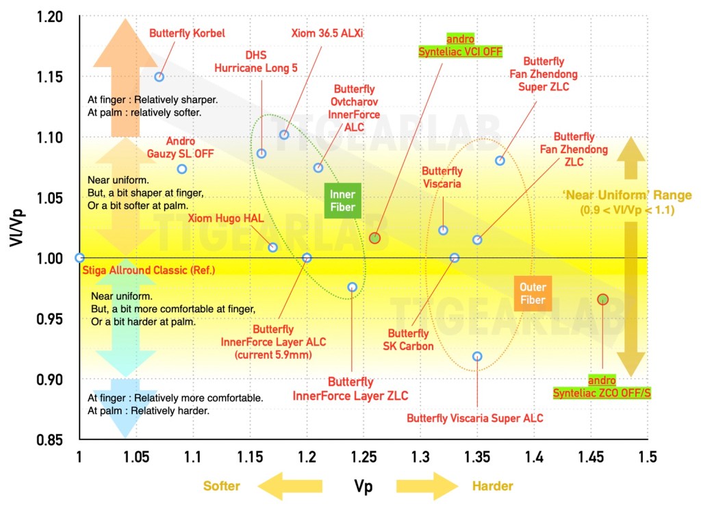 ‘Synteliac ZCO OFF/S’ is located further to the right than ‘Outer Fiber’ group. We can understand that ‘Synteliac ZCO OFF/S’ is a very hard blade. But, its Vl/Vp is under 1.0, differently from most of the blades in ‘Outer Fiber’ group. It means that the hard feeling transmitted to the index finger is alleviated to some extent. Anyway, it is clear that the feeling of ‘Synteliac ZCO OFF/S’ totally different from the feeling of ‘Fan Zhendong ZLC’ or ‘Fan Zhendong Super ZLC’.
