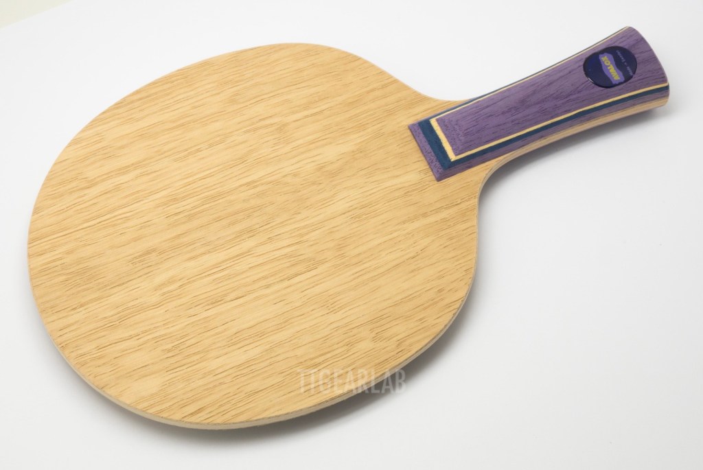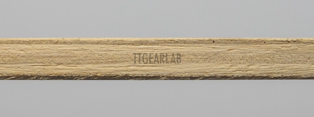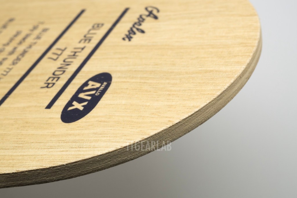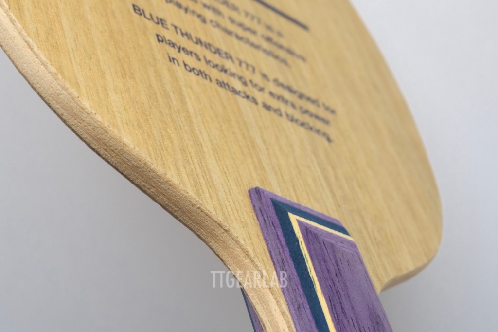 The construction looks similar to that of traditional 7-ply construction of ‘Clipper’ type. However, it is much thinner than traditional 7-ply wood blades, and there isn’t any dyed layer. The top layer is Limba, and the middle layers is also Limba. Three center layers are Ayous. Overall thickness is around 6.2mm. We can find the crucial difference between ‘Blue Thunder 777’ and ‘P700’ in middle layer – Limbs vs. Meranti.