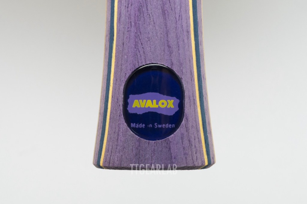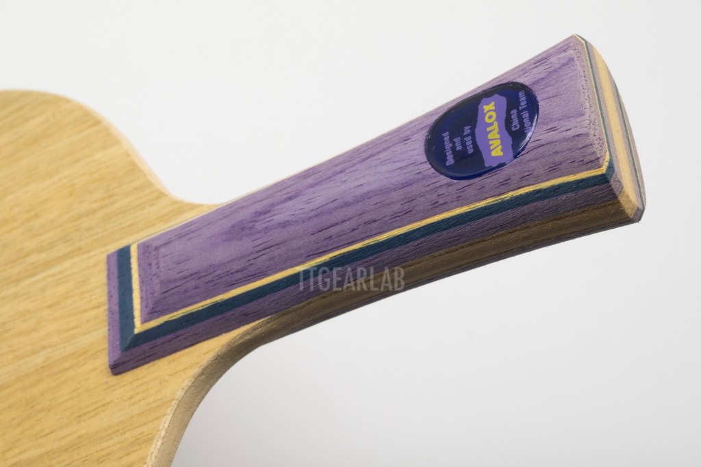 The width of FL (flared) handle is around 27mm (at head side) ~ 28mm (at the middle of handle) ~ 36mm (at the end), and the thickness of FL handle is round 22mm (at thumb) ~ 25mm (at the end). The size of ST (straight) handle which isn’t shown in the picture is around 28mm (width) x around 23mm (thickness). The transparent lens at handle looks similar to that of Stiga, but a bit smaller. ‘Avalox’ logo and the text that this blade is made for Chinese National Team are shown in the lens. But, the name of blade isn’t shown.