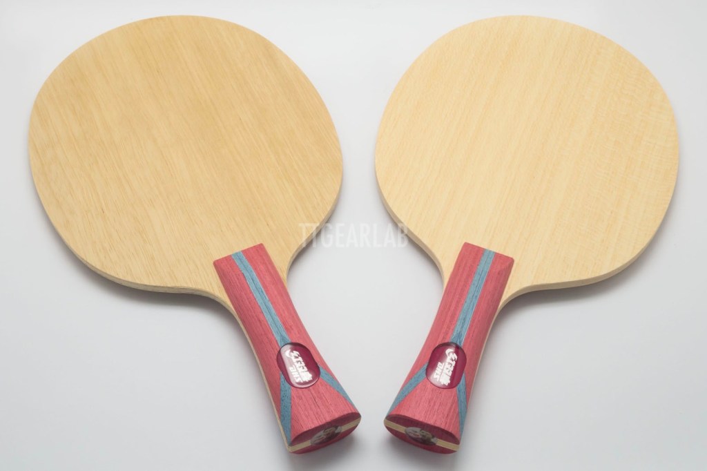 Left if ‘Fang Bo B2 (ALC)’ which is an inner ALC blade, and right is ‘Fang Bo B (7-ply)’. The graphic design of those two basically identical to each other, and we can distinguish those two only by the kind of top layer woods when we can see only the foresides of those two blades. Another model which isn’t shown in this picture is ‘Fang Bo B2X’, and it can be easily distinguished by the point color in the handle. The point color of ‘Fang Bo B2X’ isn’t light blue but light gray.