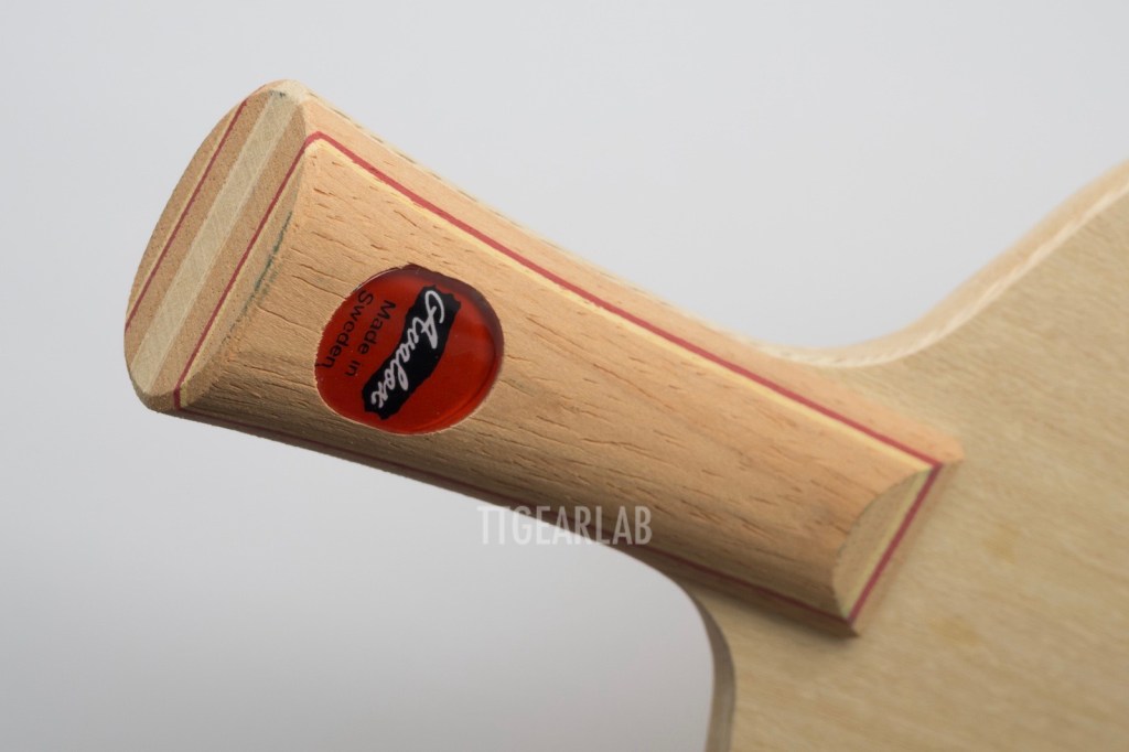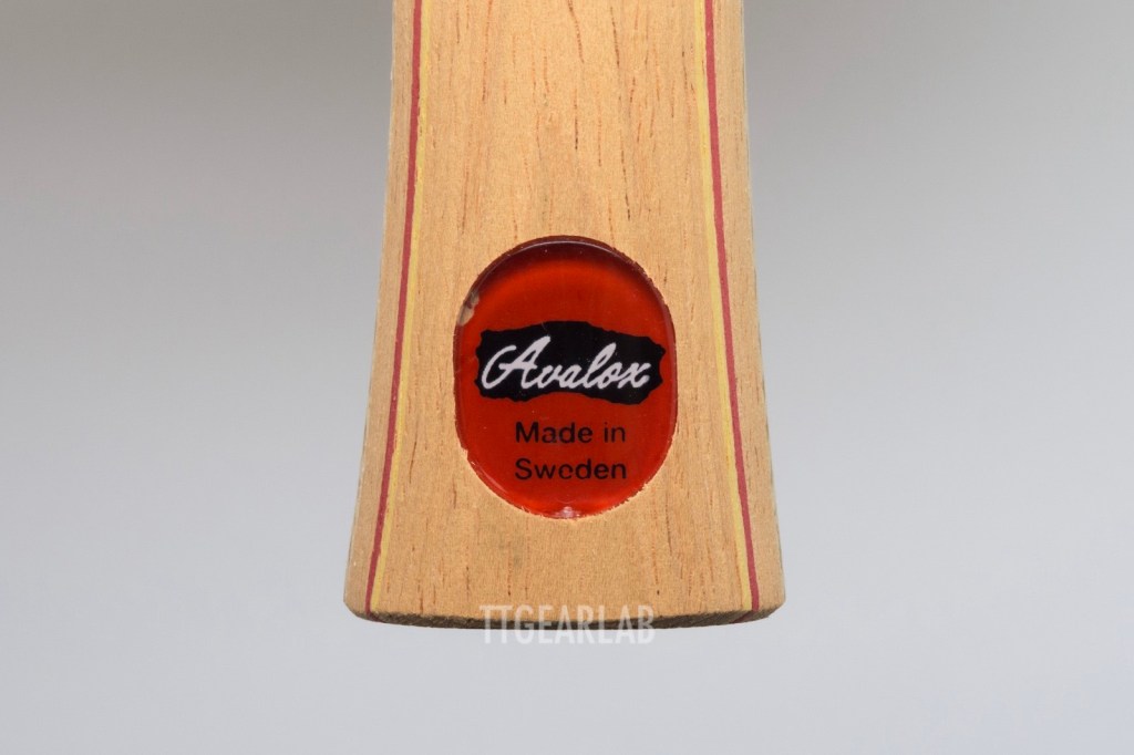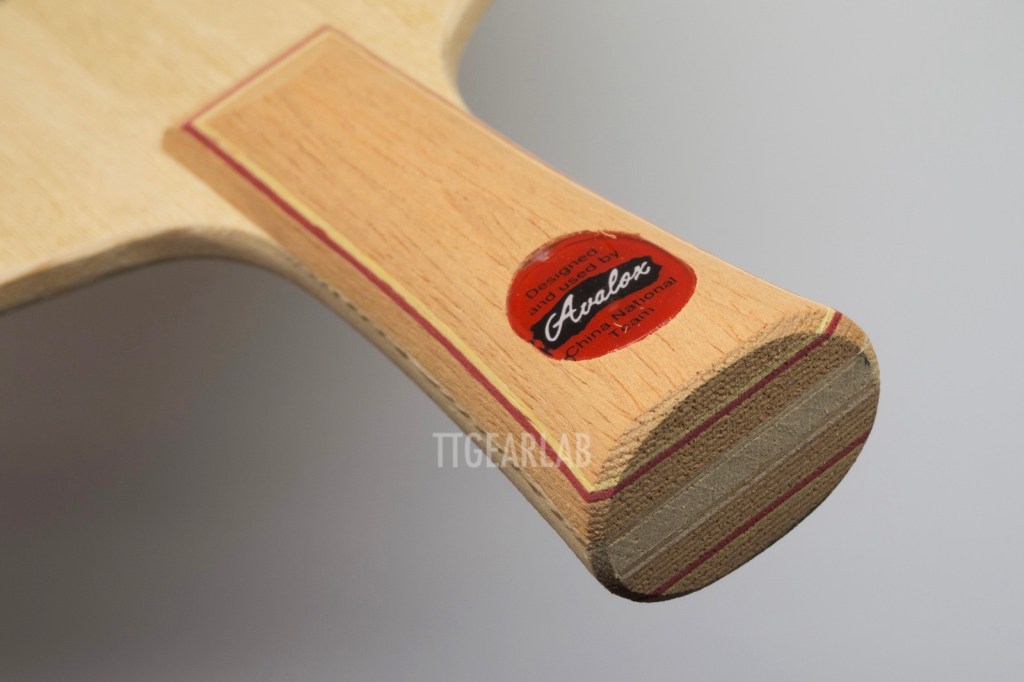 The width of FL (flared) handle is around 27mm (at head side) ~ 27.5mm (at the middle of handle) ~ 35mm (at the end), and the thickness of FL handle is round 22mm (at thumb) ~ 25mm (at the end). The size of ST (straight) handle which isn’t shown in the picture is around 28mm (width) x around 23mm (thickness). The transparent lens at handle looks similar to that of Stiga, but a bit smaller. ‘Avalox’ logo and the text that this blade is made for Chinese National Team are shown in the lens. But, the name of blade isn’t shown.