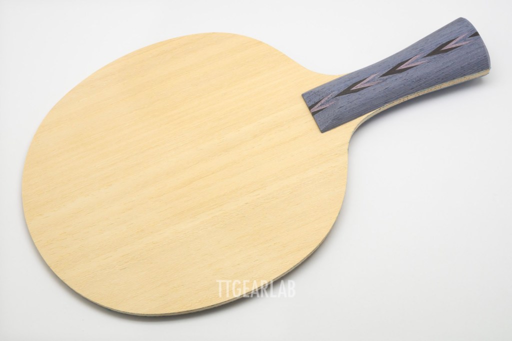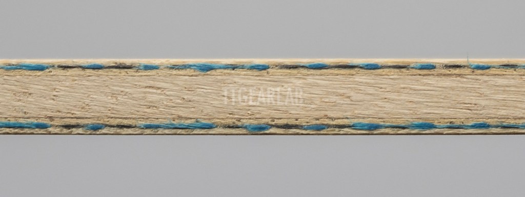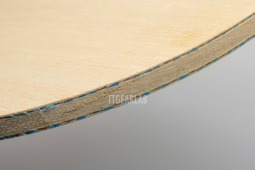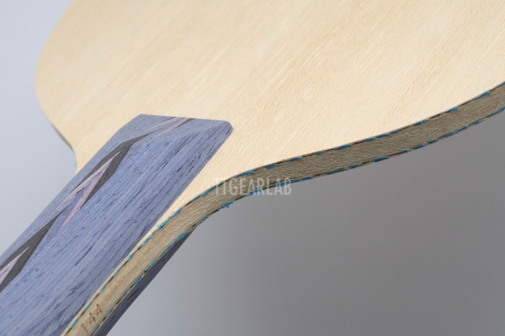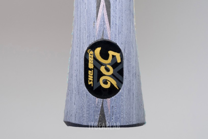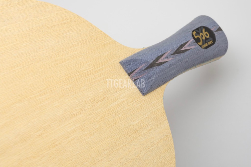 The blade construction of ‘506X’ is typical outer-ALC construction of ‘Viscaria’ type. The top layer is Koto, the middle layer is Ayous, and the center layer is Kiri. ALC is inserted directly under the top layer. The color of Arylate (or Aramid) fiber is blue. Overall thickness is around 5.8mm. (Just a bit thicker than 5.8mm.)