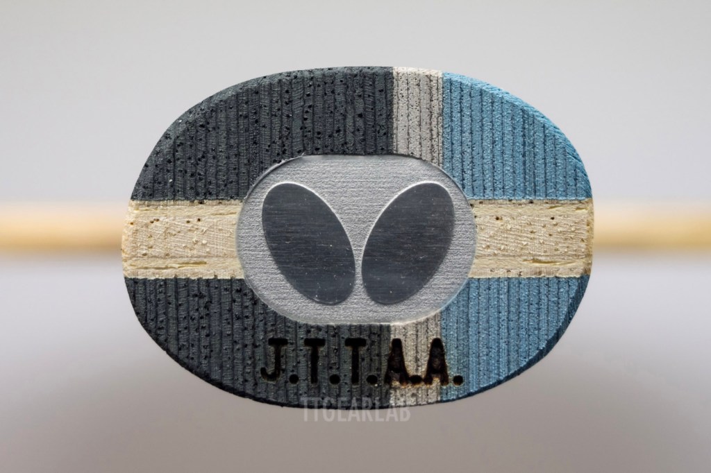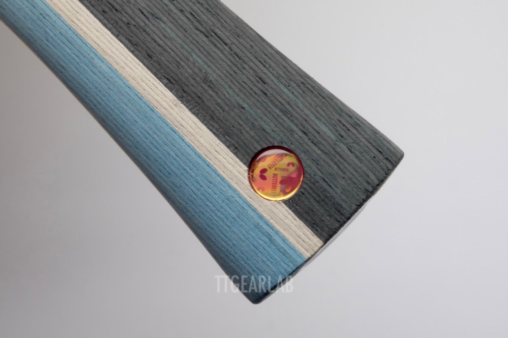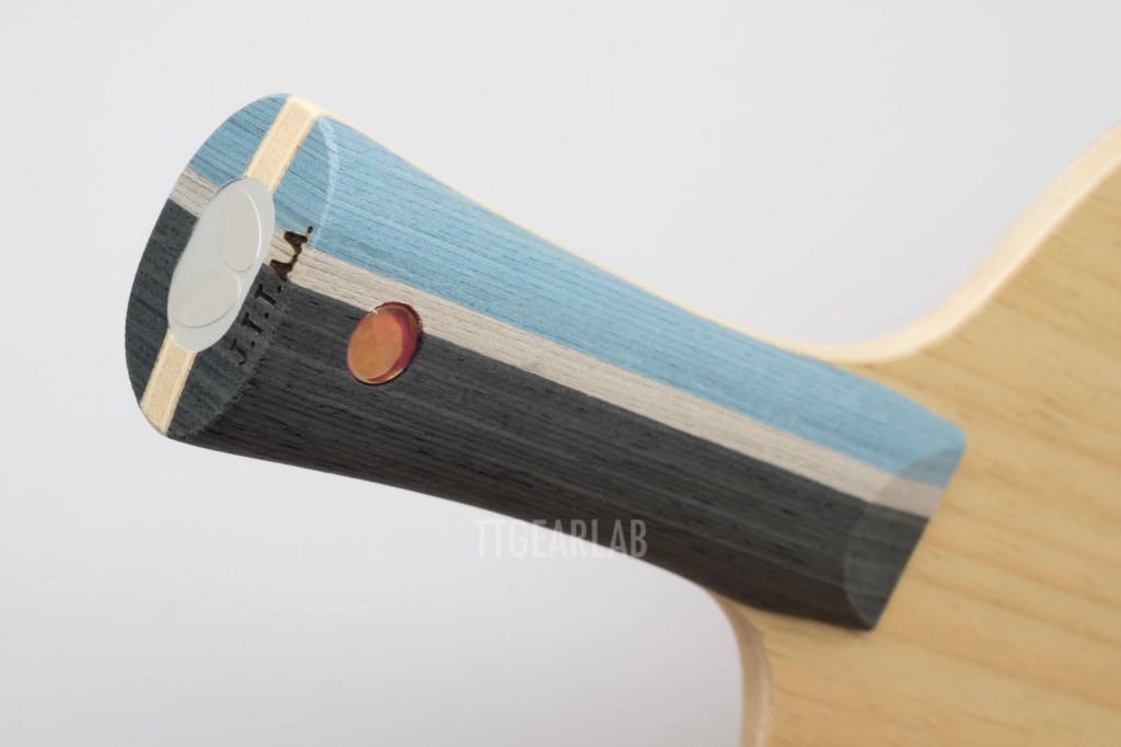 An aluminum plate with Butterfly logo is applied at the end of handle. The shape of these aluminum panels is rounded on the sides rather than the square shape typically seen on Butterfly blades. We can see this aluminum plate from some Butterfly blades for European market.