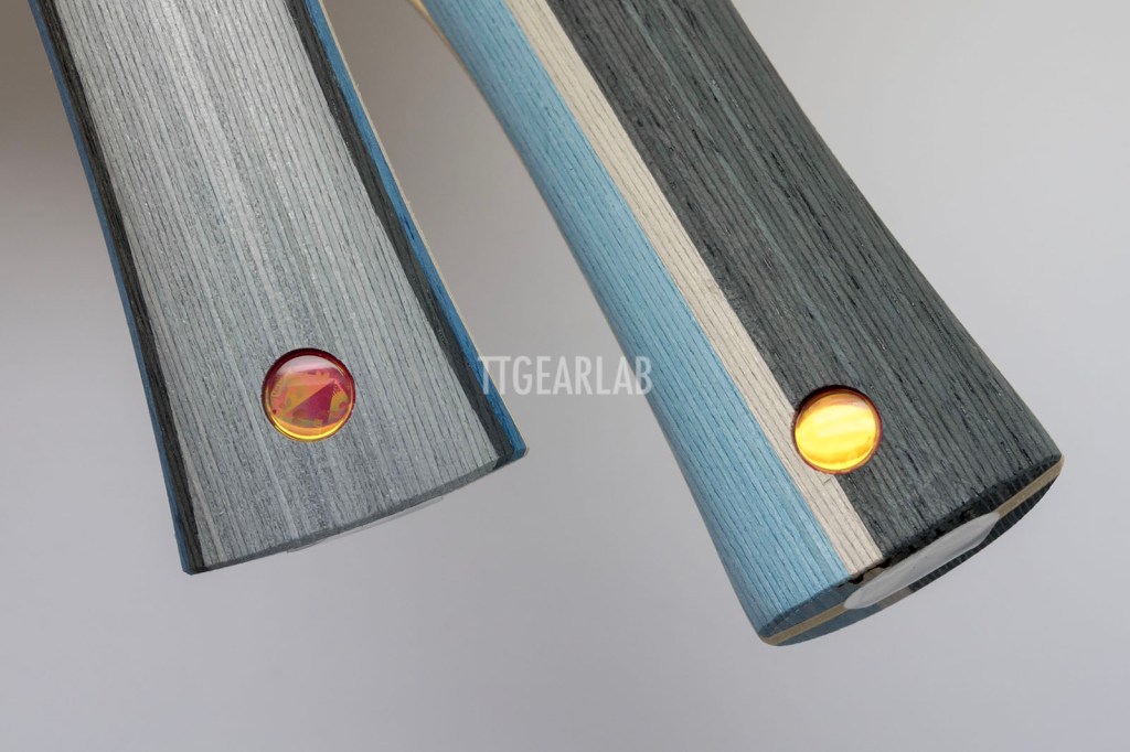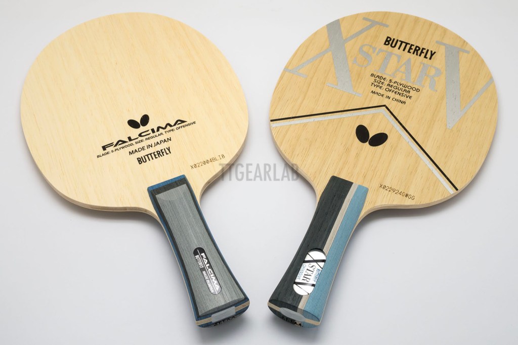 ‘Falcima’ (left) and ‘Xstar V’ (right). Both blades are 5-ply wood blades, but their constructions are significantly different from each other. ‘Falcima’ is a 5-ply wood blade with a somewhat unusual construction whose top layer and middle layer are Koto, while the construction of ‘Xstar V’ is a typical thin 5-ply wood all-round construction with Limba top layer.