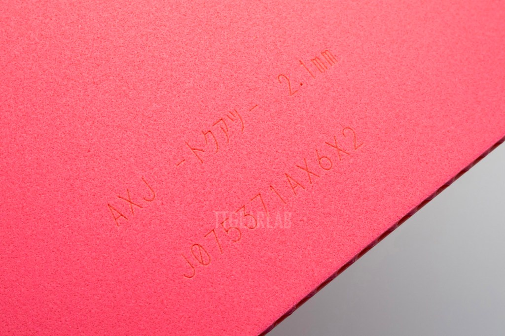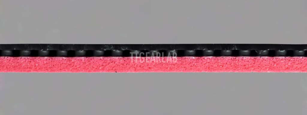 The color of sponge is pink. This is ‘Spring Sponge’ that is basically same as that for ‘Tenergy’ series, but the sponge density is lower by 1 degree than that of ‘Tenergy 05’ or ‘Tenergy 64’. Sponge density is 35 degree (in Butterfly standard). It is around 46 degree in ESN standard. It is softer than the 36 degree sponge of ‘Tenergy 05’.