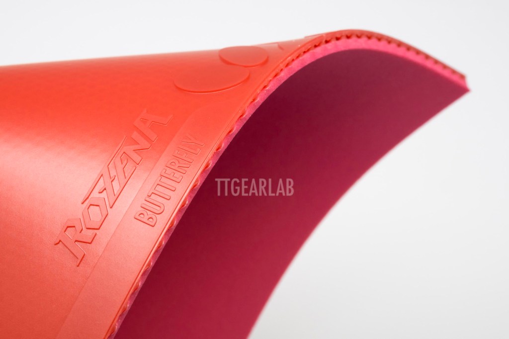 The construction of top sheet is different from ‘Tenergy 05’, and is also different from ‘Tenergy 64’. The pimple pitch is 2.4mm. So the pimples of ‘Rozena’ are more densely arranged than those of ‘Tenergy 64’ but more sparsely than those of ‘Tenergy.