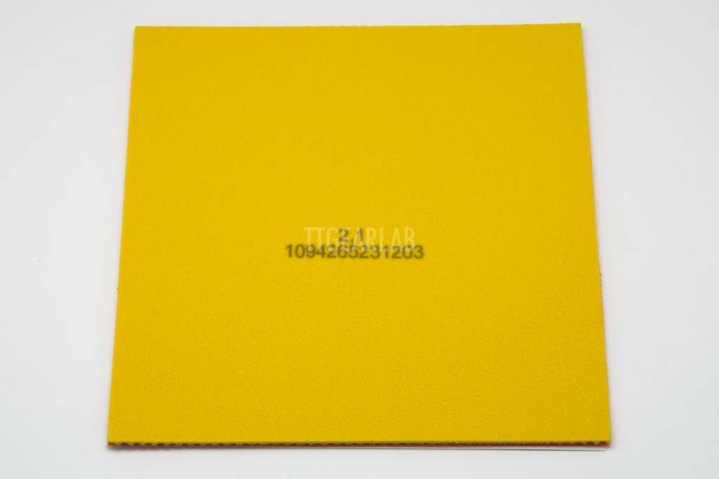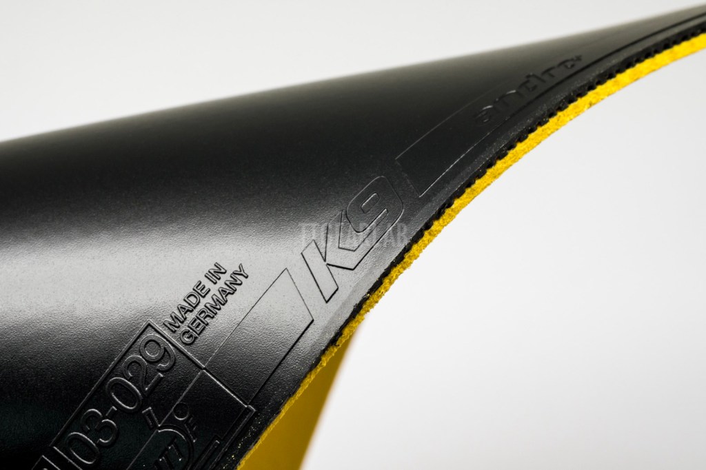 The sponge of ‘K9’ is a new-generation tension sponge whose pores are visibly big. But, the pores aren’t as big as those of recent ‘Rasanter’ series. The color of sponge is yellow which is the theme color of ‘K9’. The sponge density is 48~50° in German standard (= 37~38° in Butterfly standard).