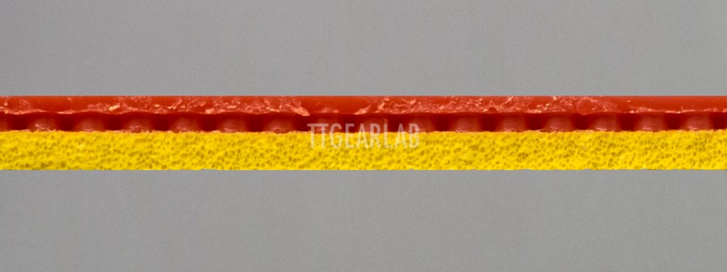 The top sheet of ‘K9 Turbo’ is same as that of ‘K9’. So, the pimple geometry of ‘K9 Turbo’ is also ‘Tenergy 05’ type in which cylindrical pimples are arranged densely. The base of top sheet isn’t especially thin or thick, and therefore, maximum available sponge thickness is 2.1mm.