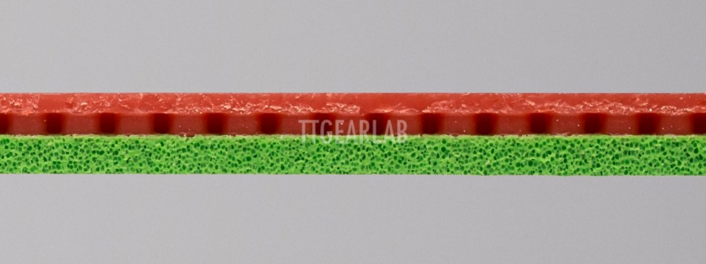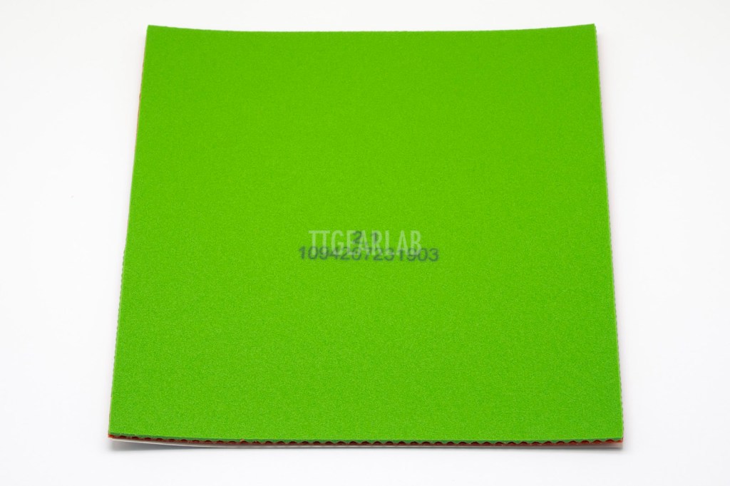 The sponge of ‘K9 Turbo’ is also a new-generation tension sponge whose pores are visibly big. The sponge density is 48~50° in German standard (= 37~38° in Butterfly standard) which is identical to that of yellow sponge of original ‘K9’. This green sponge provides stronger click feeling and more catapult effect when compared with the sponge of original ‘K9’.