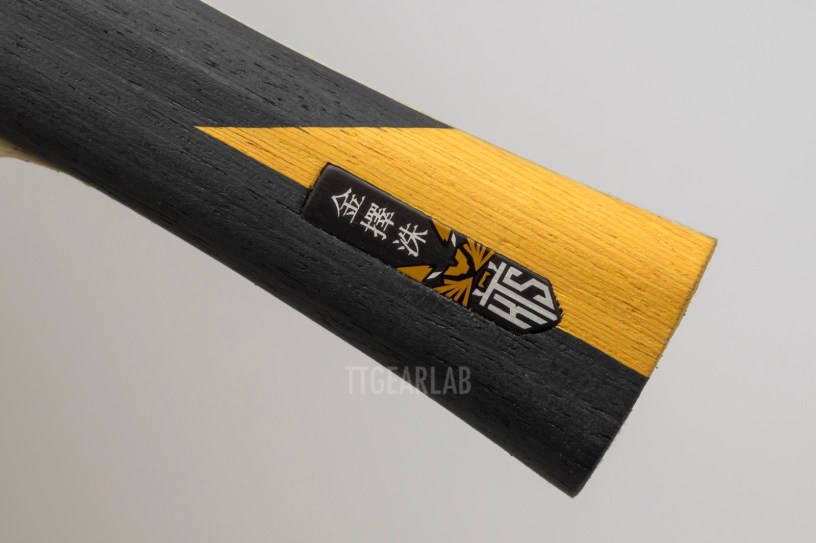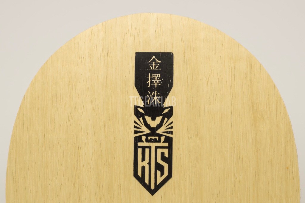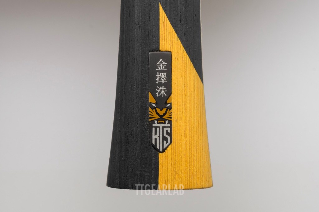 The Tiger Face ‘金擇洙(Kim Taeksoo)’ logo which is also applied to the top blade family – ‘Problade’ series – is printed on the top of the foreside of blade head. And, on the bottom of blade head, the logo of ‘Foundation’ series, the name of blade model, the name of artificial fiber, the construction and speed sign (= OFF+) are printed. In the standard of KTS, the speed sign ‘OFF’ means that the blades is for offensive play by topspin, and the speed sign ‘OFF+’ means that the blade lays emphasis on speed.