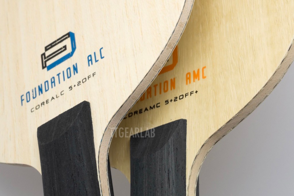 ‘Foundation ALC’ (left) and ‘Foundation AMC’ (right) are the standart thin 5+2 ply outer-type blades with Koto top layer and Limba top layer respectively. But, those two are significantly different from each other in overall concept and elasticity. ‘Foundation ALC’ (left) pursuits the balance between the power and the stability of topspin, while ‘Foundation AMC’ (right) pursuits the high speed and destructive power of offensive shots.