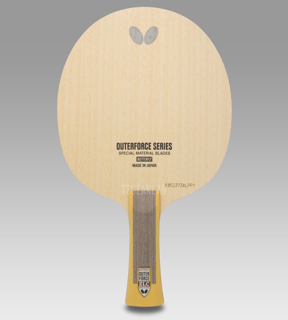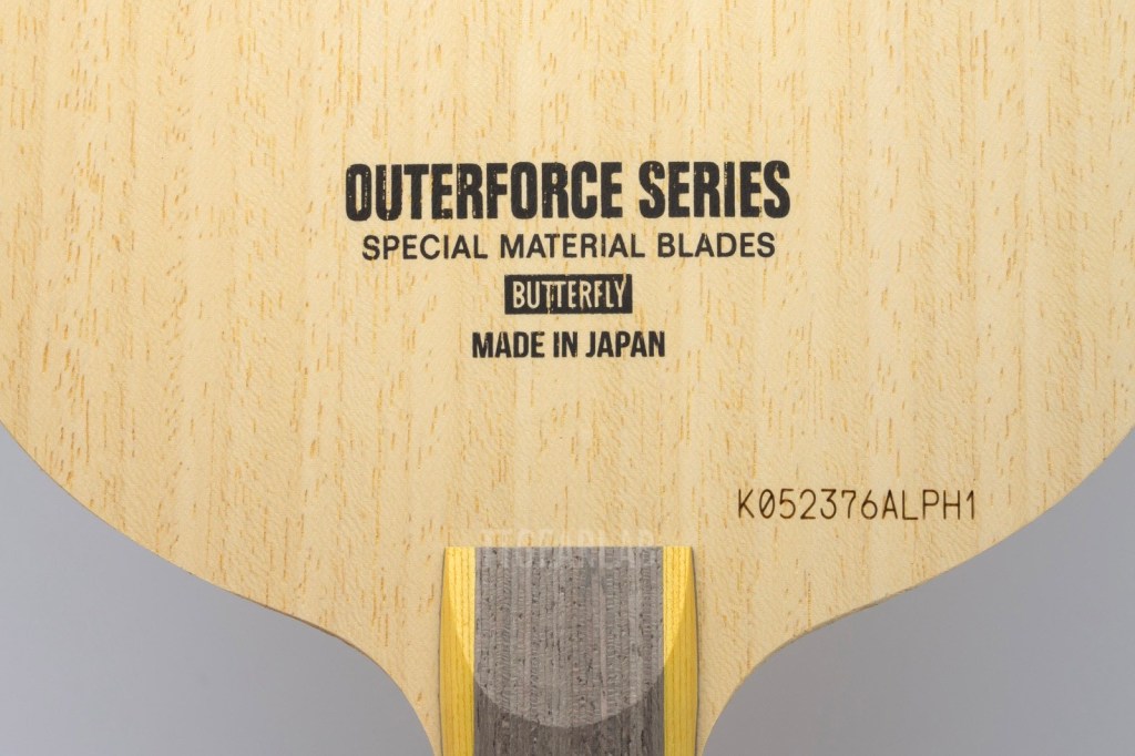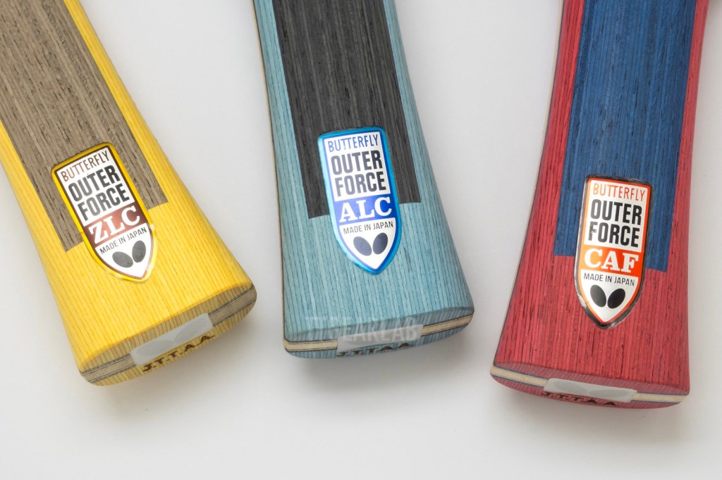 Butterfly’s ‘OuterForce’ series, released in March 2025, is the blade family for intermediate level players which is recommended as the next step of entry-level blades. Therefore, ‘OuterForce’ series is easier to handle and lower in elasticity when compared to existing outer-type blades in Butterfly range. Of course, ‘OuterForce’ series is faster than that of Butterfly inner-type blades represented by ‘InnerForce Layer’ series, because artificial fiber is located directly under its top layer. ‘OuterForce’ series consists of three models – ‘OuterForce ZLC’, ‘OuterForce ALC’ and ‘OuterForce CAF’. Three models share a basic construction, differeing only in thickness and artificial materials.