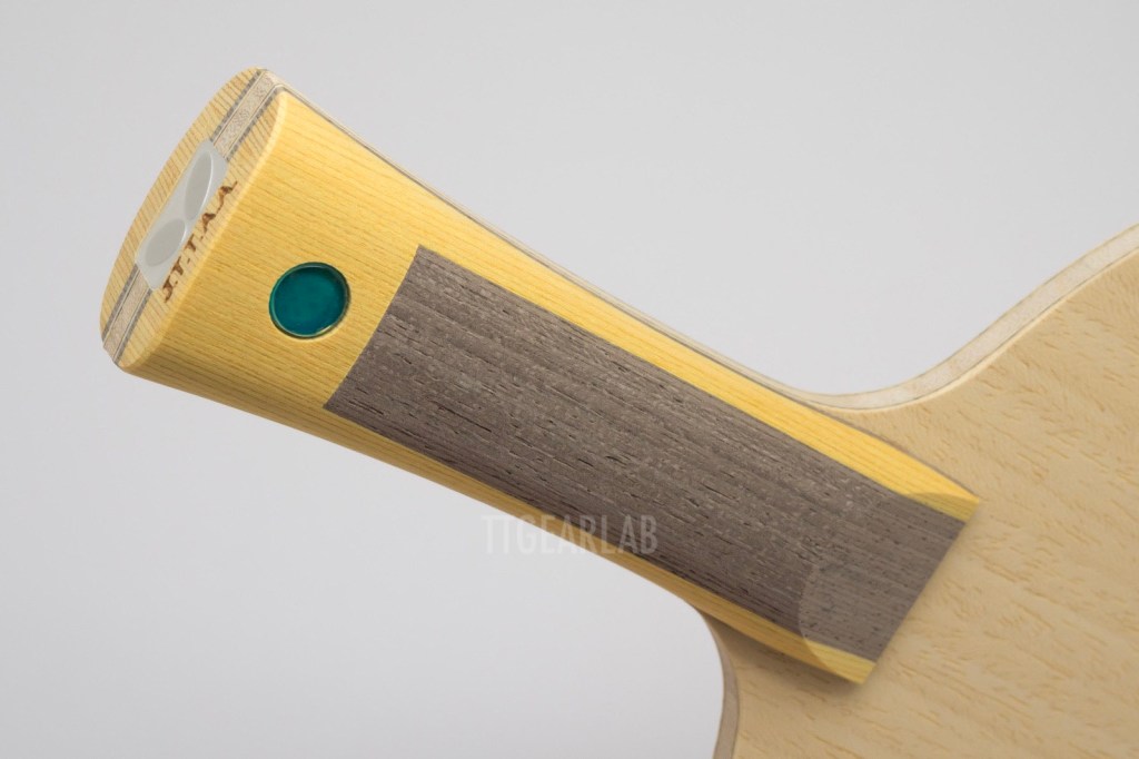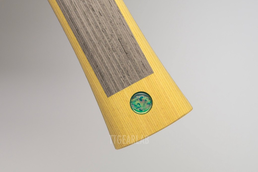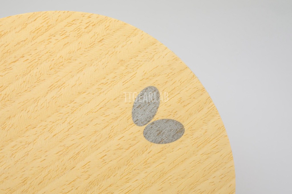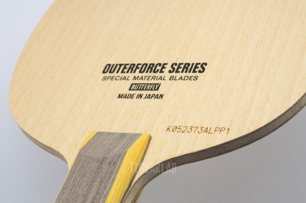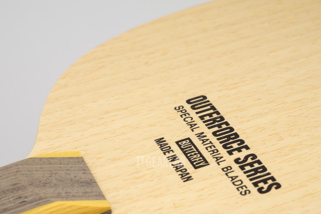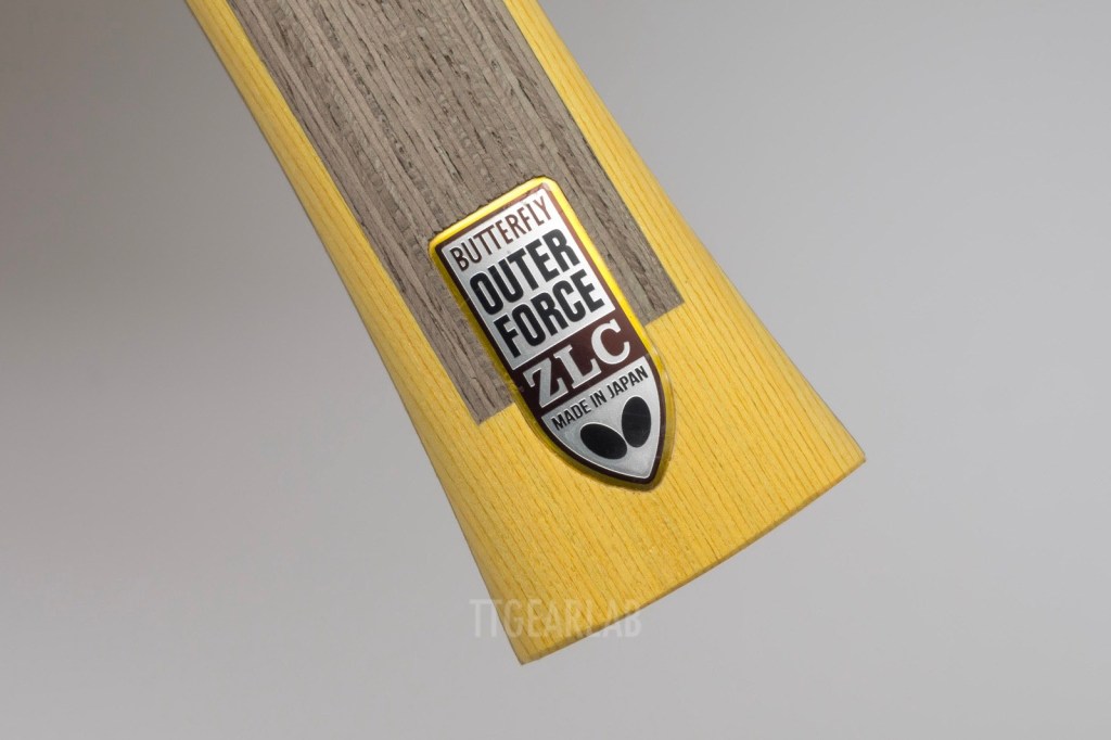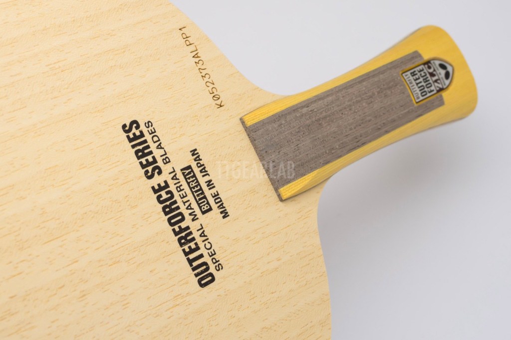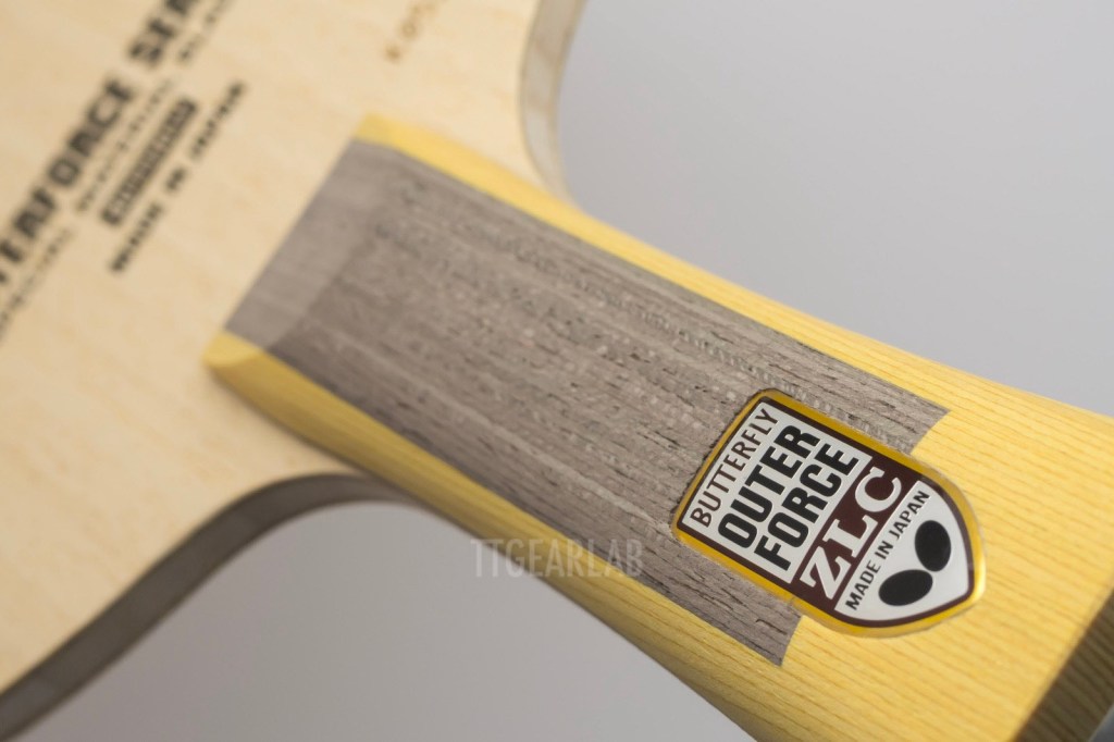 The construction of ‘OuterForce ZLC’ is 5+2 ply outer-type construction. But it is different from ordinary outer-type construction that can be seen from most of existing outer-type blades. The top layer is Ayous, and ZLC is placed directly under the top layer. The middle layer is Ayous, and the center layer is Kiri. Overall thickness is around 5.9mm. It is very unusual that the top layer isn’t Koto or Limba but Ayous. Its purpose seems to provide a soft hitting feeling and high controllability.