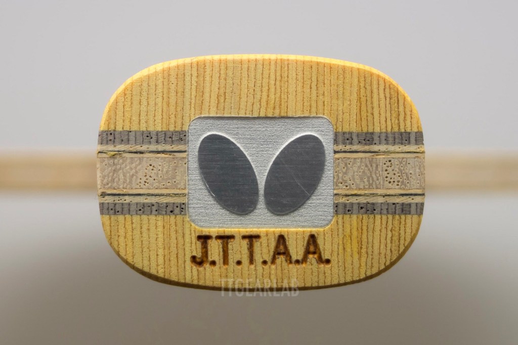 Shield-shaped Aluminum plate at the foreside of handle includes the name of blade and the logo of Butterfly. Small, rounded plastic lens is applied at the backside of handle.