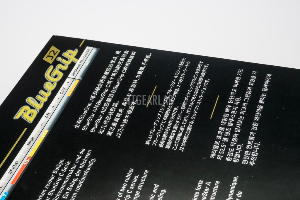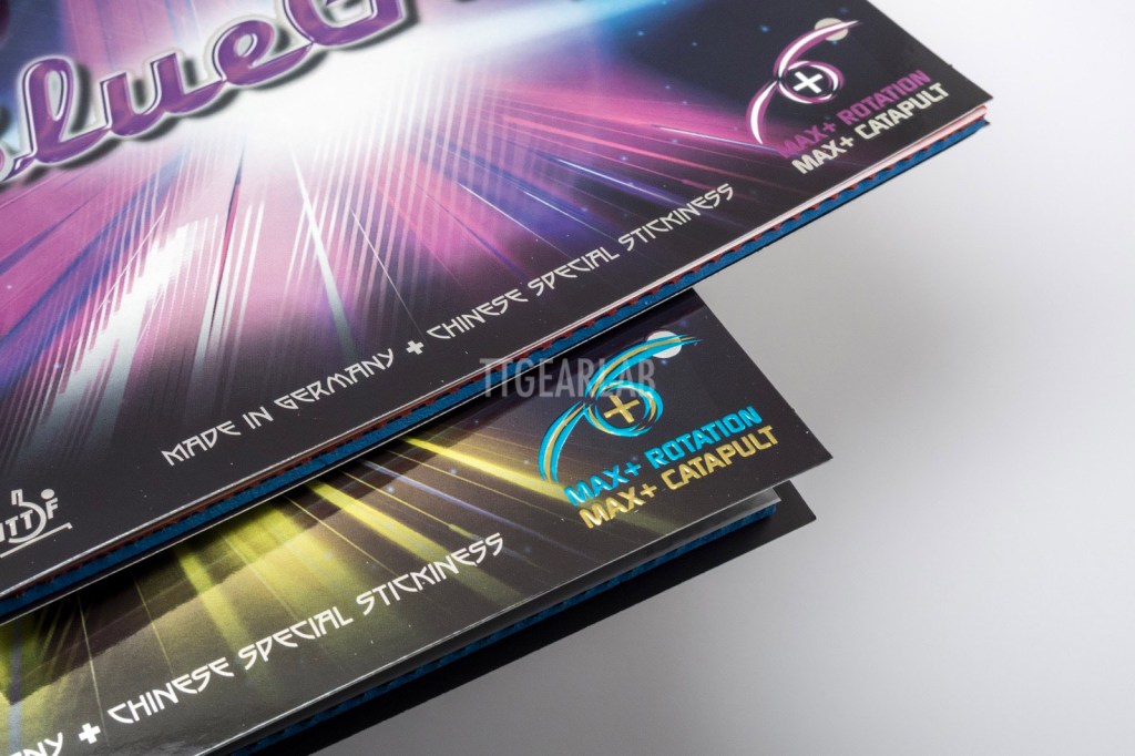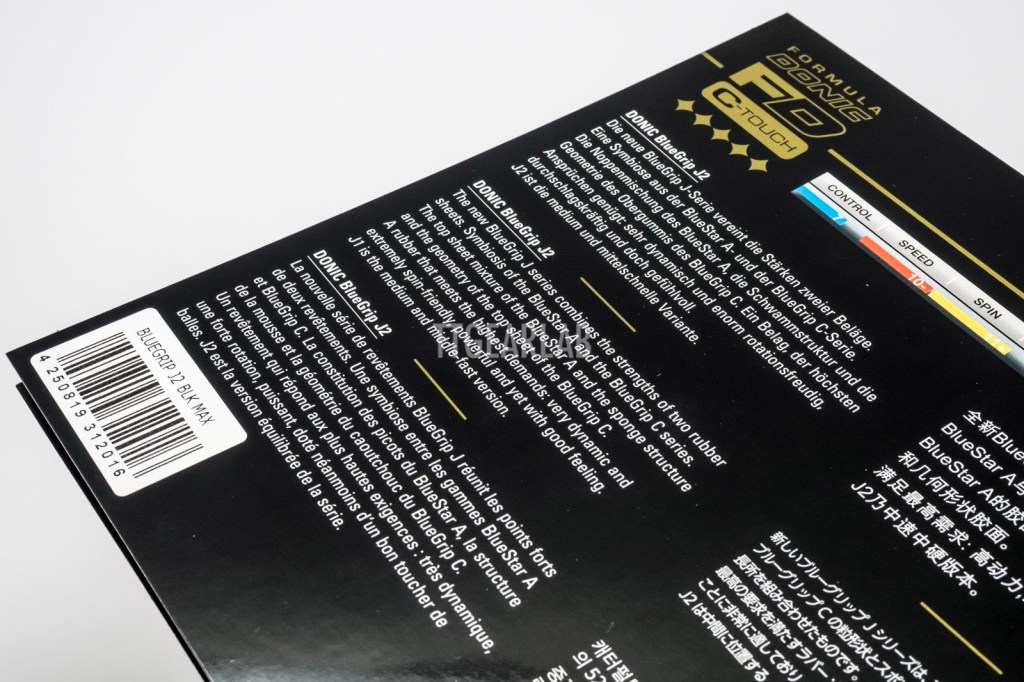 At the bottom of the foreside of packaging, the text ‘Made in Germany + Chinese Special Stickiness’ expresses that ‘BlueGrip J’ is German tension rubber family which is close to Chinese sticky rubbers.