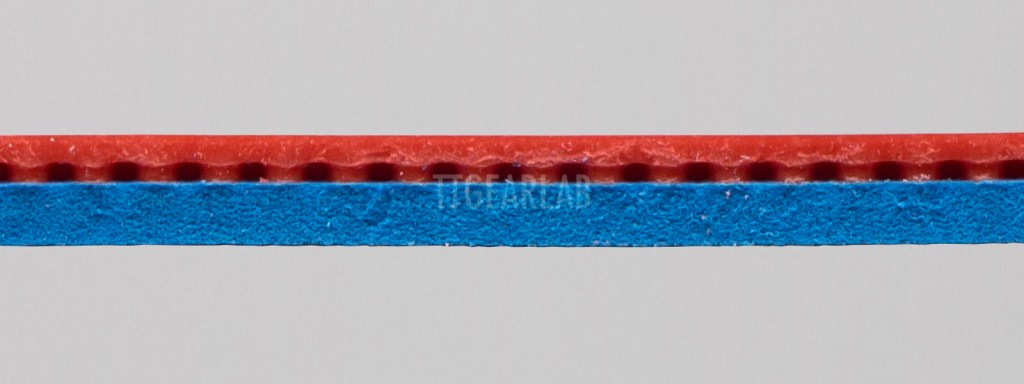 The base of top sheet is somewhat thick but not excessively thick. And, the pimple is somewhat low, but not as low as that of ‘Hurricane 3’. So we can expect that the geometry of the top sheet is designed with some speed in mind. Overall structure of top sheet is same as that of ‘BlueGrip C’, but the rubber formula isn’t that of ‘BlueGrip C’ but that of ‘BlueStar A’. The top sheet of ‘BlueGrip J’ combines the shape of ‘BlueGrip C’ and the material of ‘BlueStar A’ to take advantage of both. The sponge is inherited from ‘BlueGrip C’, but density has been lowered for making the balance better.