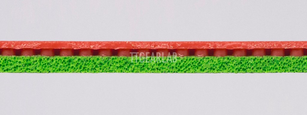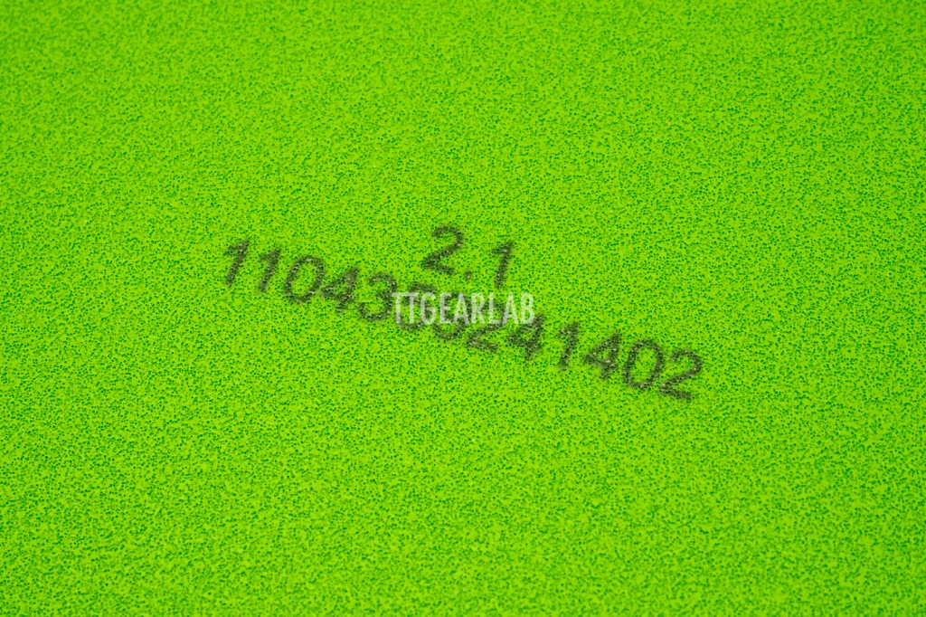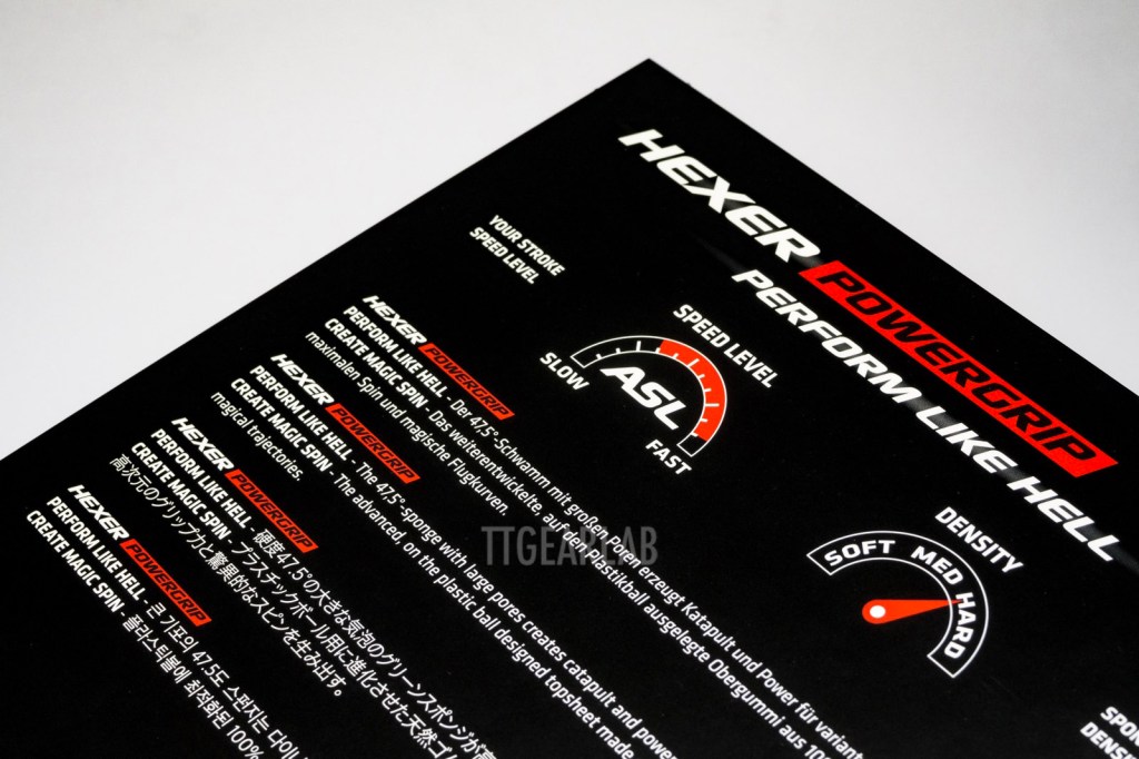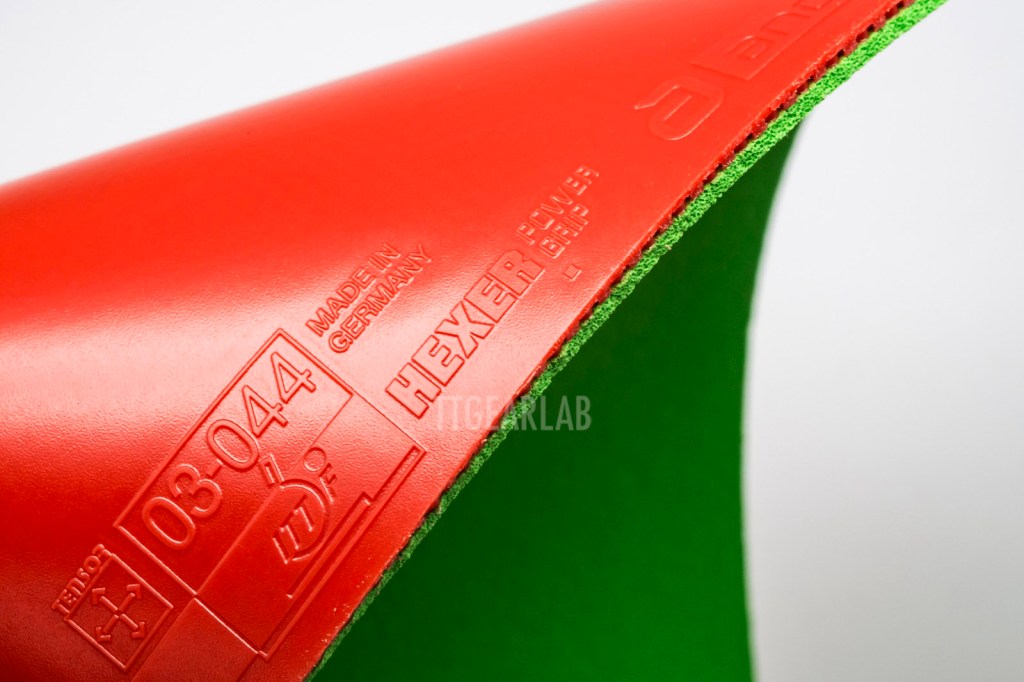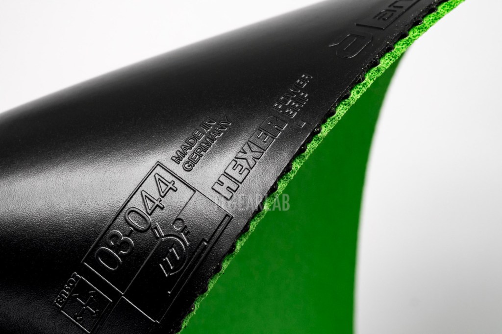 The color of sponge is green which is same as the color applied to ‘Rasant’ series and its successor, ‘Rasanter’ series. That is because ‘Hexer PowerGrip’ is the softened version of former ‘Rasant PowerGrip’. ‘Hexer PowerGrip’ is equipped with 47.5° sponge which is softened by 2.5° from the sponge of ‘Rasanter PowerGrip’.