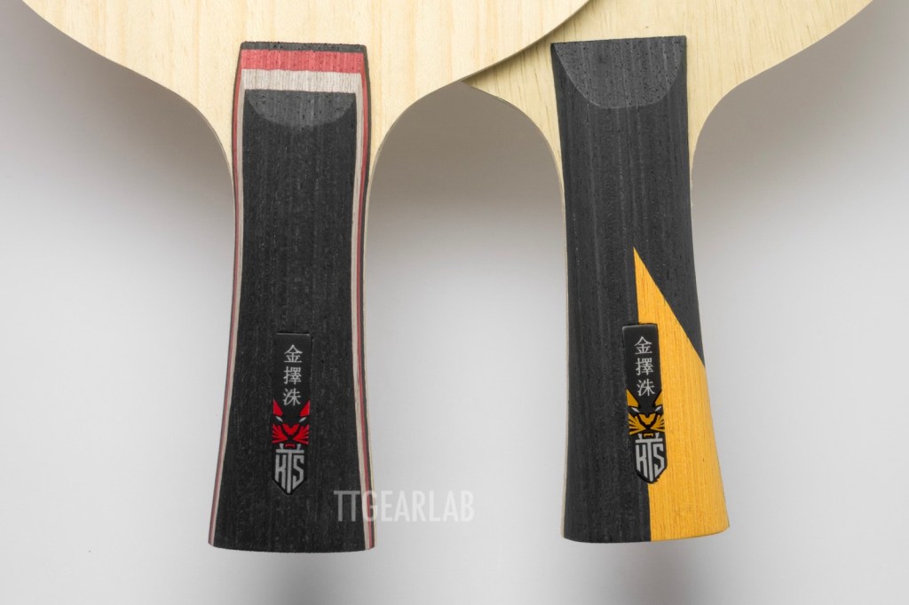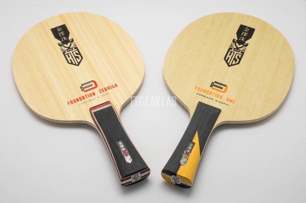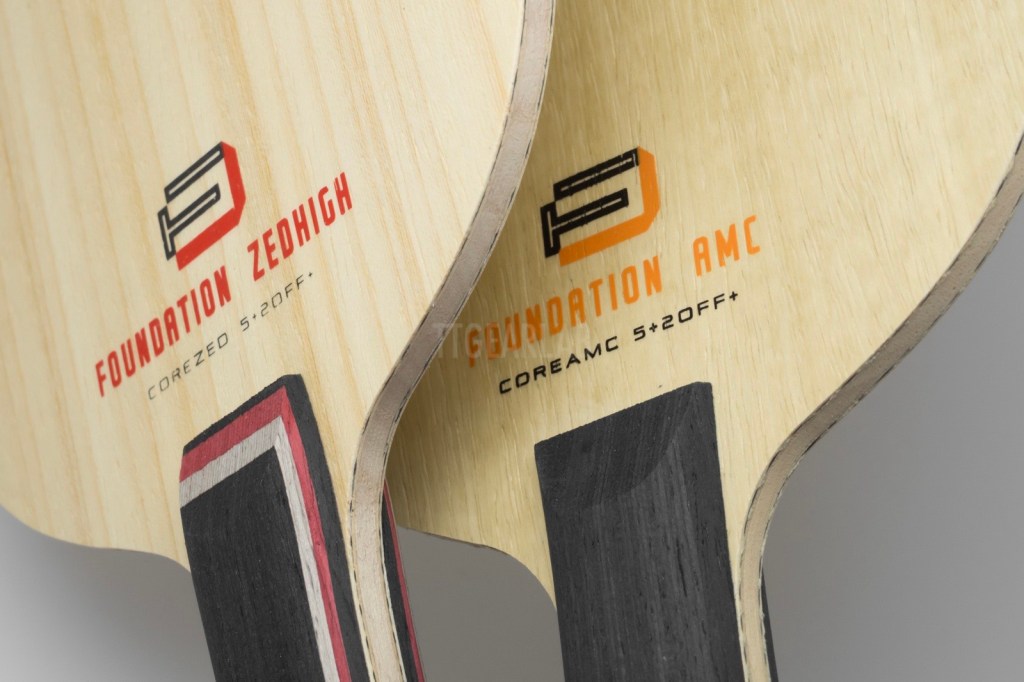 ‘Foundation ZED High’ (left) and ‘Foundation AMC’ (right) are 5+2 ply outer-type fiber blades those provide high speed. But, two blades are distinguished from each other by the materials and the targeted playing characteristics. ‘Foundation ZED High’ is a ZLC blade with Koto top layer, while ‘Foundation AMC’ is an Aramid Carbon blade with Limba top layer. ‘Foundation ZED High’ is focused on precise control of powerful topspin, while ‘Foundation AMC’ is focused on the ease of power play.
